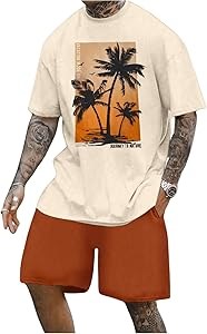 Элегантный стиль: комплект включает футболку с коротким рукавом с принтом кокосового дерева и шорты с завязкой на талии, подходящий для повседневного ношения, активных занятий и отдыха.