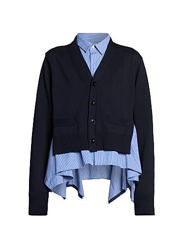 Этот уникальный кардиган от Sacai сочетает в себе классический трикотаж с рубашкой на пуговицах. Боковые драпировки и подолы в форме носового платка добавляют объем и интерес.