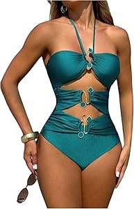 - Характеристика: Купальник с металлическими деталями, завязками на шее, вырезами спереди, сборками, открытой спиной и однотонный