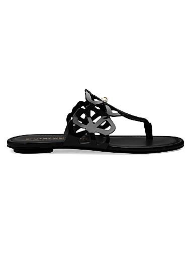 Эти сандалии на ремешках Jasmine от Stuart Weitzman выполнены из глянцевой лакированной кожи и имеют оригинальный цветочный вырез.