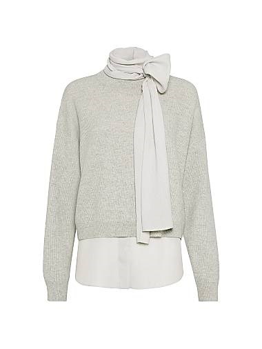 Свитер с английским ребристым узором и съемной блузкой с бантом из кашемира от Brunello Cucinelli