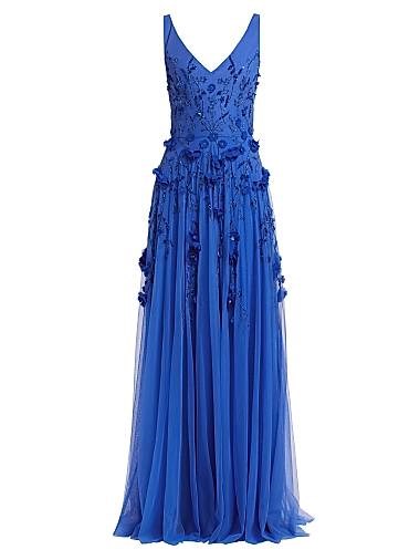 Платье Jane от Theia выполнено с изысканными цветочными вышивками и бисером, которые переходят от V-образного выреза к сборной юбке из органзы.