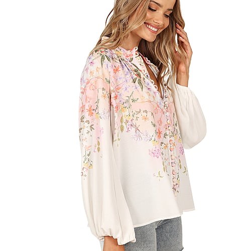 Стильный и элегантный топ с высоким воротником, длинными рукавами с эластичными манжетами и функциональными пуговицами спереди. Цветочный принт добавляет женственности.