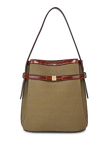 Сумка-бакет выполнена в Италии из ткани с кожаными вставками. Этот стиль выделяется уникальным поясным ремнем, который можно затянуть для создания компактного силуэта или оставить свободным для дополнительного пространства.