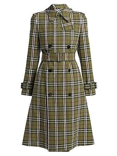 Тренчкот выполнен из тяжелого растяжимого льна и украшен фирменным клетчатым узором Burberry.
