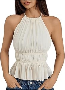 Плиссировка, халтер, без рукавов, открытая спина, рюшевый подол, однотонный – идеальный топ для женщин.