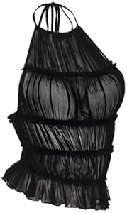 Дизайн: без рукавов, с воротником-халтер, завязкой на спине, прозрачной сеткой и воланами, стиля Y2K.