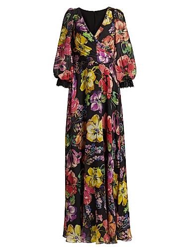Платье, выполненное из цветного шелкового шифона, от Teri Jon выделяется своим V-образным вырезом, собранным bodice и рукавами-блузонами с кружевной отделкой.