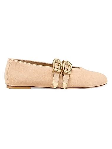 Туфли Maven Mary Janes от Stuart Weitzman изготовлены из мягкой замши и имеют дизайн с двойным ремешком с золотистой фурнитурой.