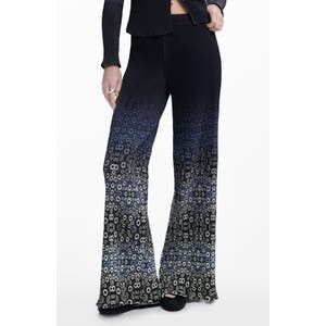 Погрузитесь в атмосферу ретро с этими брюками, украшенными ярким градиентным принтом и расклешенными штанинами. Внизу они имеют эффектный рюшек.