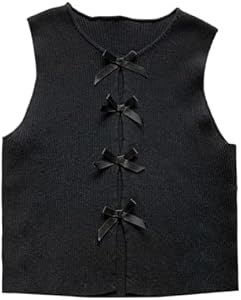 Особенности: спереди завязка в виде банта, вырез, круглый вырез, без рукавов, укороченная длина, свитер-жилет для женщин.