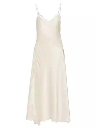 Платье Luciene от бренда Ulla Johnson с цветочной вышивкой и панелями из кружевной сетки, выполнено в стиле слепдресс. Это великолепное изделие заканчивается самозавязками.