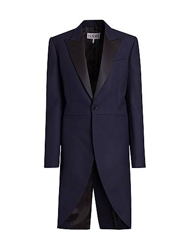 Смокинг в стиле оверсайз Loewe, изготовленный в Италии, с пиковыми лацканами и удлинённой спинкой.