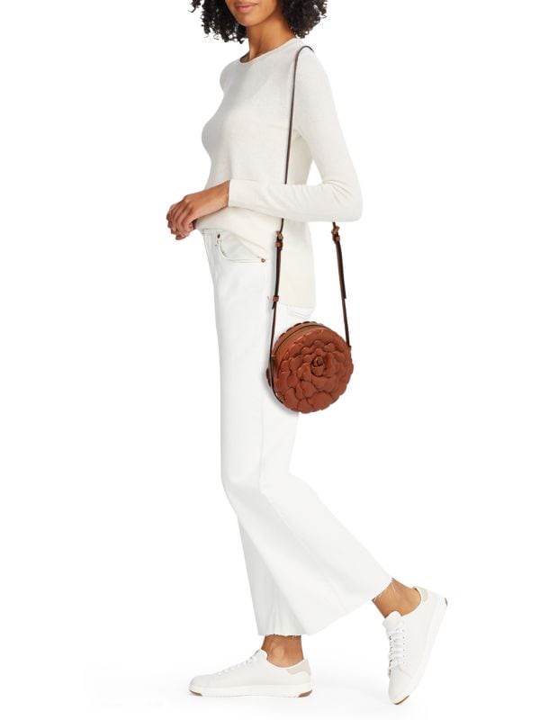 Кожаная сумка через плечо с уникальной круглой силуэтой, украшенная розовым мотивом, идеально подходит для повседневного использования.
