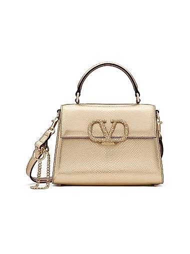 Маленькая сумка VSling из металлической кожи карунг с застежкой VLogo Signature, украшенной кристаллами Swarovski. Багажник оснащен ручкой и регулируемым плечевым ремнем, что позволяет носить его ручной или на плечах.