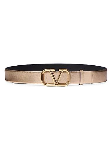 Реверсивный ремень с логотипом VLogo, изготовленный из металлизированной и блестящей телячьей кожи.