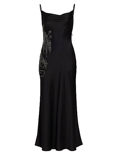Платье без рукавов, выполненное из блестящего сатина, обладает отделкой из бисера по бокам и открытой спинкой с перекрестными бретелями.