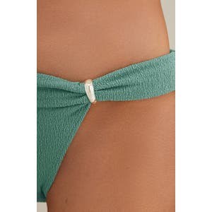 Металлическая фурнитура в серебристом цвете позволяет легко настраивать линию бедер этих вкусных бикини.