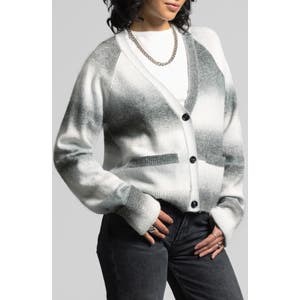 Укутайтесь в тепло этого пушистого кардигана с V-образным вырезом, украшенного привлекательными полосами омбре и отделкой из мягкой резинки.