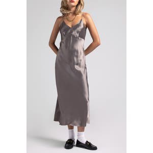 Выходите в ослепительном стиле в этом платье-слип с блестящей поверхностью в А-силуэте.