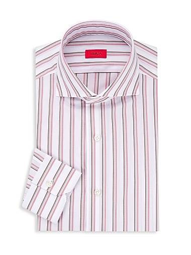 Изготовленная из легкого хлопка, эта рубашка Isaia выделяется яркими полосами, манжетами-бочонками и застежкой на пуговицах.