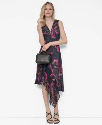 Яркое и немного загадочное, это платье без рукавов DKNY выделяется смелым принтом и каскадной рюшей, идеально подходящими для стильного выхода в вечер.