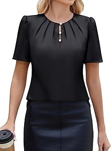 Современный дизайн: Короткие рукава и воротник-лодочка с перламутровыми пуговками и складками спереди добавляют элегантность вашему деловому образу. Свободный крой обеспечивает стильный и профессиональный вид.
