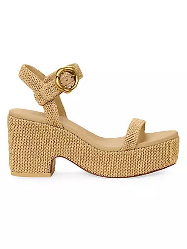 Сандалии на платформе Clara от Cult Gaia выполнены из плетеной рафии и украшены золотистой пряжкой в виде цветка на щиколотке.