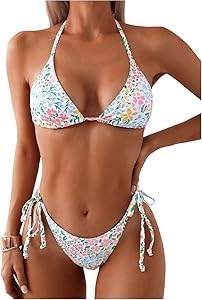Комплект бикини для пляжного отдыха, цветочный принт, регулируемый воротник, открытая спина, треугольные чашки, высокая посадка, завязки по бокам