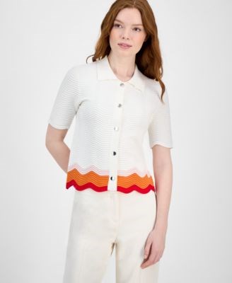 Обновлённый кардиган T Tahari станет отличным дополнением к вашему гардеробу, обыгрывая любимые основы с помощью волнистых полос яркого цвета на подоле.