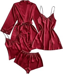 Атласный материал, контрастное кружево, тонкие бретели, V-образный вырез, без рукавов, открытая спина, шорт, мини-платье, длинный рукав на запястье, длина до бедра, пижама с поясом, 4-х предметный комплект пижам для женщин.