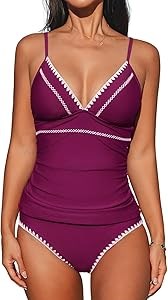 Дизайн: Этот набор танкини имеет привлекательный V-образный вырез с изящной отделкой из ракушек. Рюшированная ткань в области груди обеспечивает мягкую поддержку. Полное покрытие и комфортная растяжимость ткани обеспечивают скромную, но при этом женственную посадку.