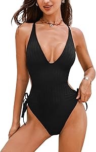Купальник с глубоким V-образным вырезом и завязками на спине, дизайн с текстурированной тканью обеспечивает стильный вид на пляже.