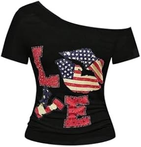 Короткие рукава, цветная блокировка, принт с флагом и губной помадой, асимметричный вырез, повседневный уличный стиль.