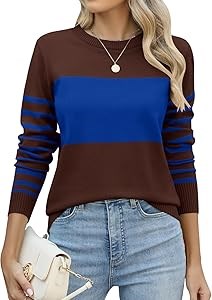 Универсальный холодный свитер: Полосатый свитер с цветным блоком обладает рифлеными деталями на запястьях, горловине и внизу. Свитер достигает уровня примерно на середине бедра и имеет свободный силуэт, что делает его идеальным для носки с джинсами или леггинсами.