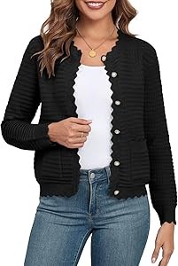 Модный дизайн: Кардиган с милыми волнистыми краями, длинными рукавами, однотонный и в полоску, круглой горловиной, манжетами и подолом с рибанной вязкой, пуговичной застежкой и двумя накладными карманами спереди. Элегантные пуговицы и текстурированная ткань придают этому классическому кардигану роскошный вид, позволяя легко создать стильный образ.