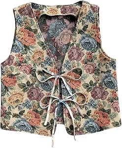 Бохо жилет, ретро цветочный графический дизайн, жилет-куртка, завязки на банте.