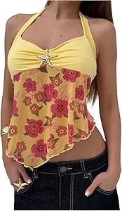 • Декор в виде морских звёзд, рюши спереди, цветочный принт, завязывающаяся шея, асимметричный подол.