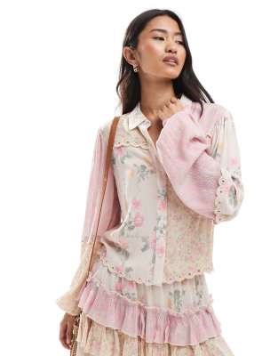 Женственная розовая блузка с цветочным орнаментом, объёмными рукавами и гофрированной отделкой от Miss Selfridge