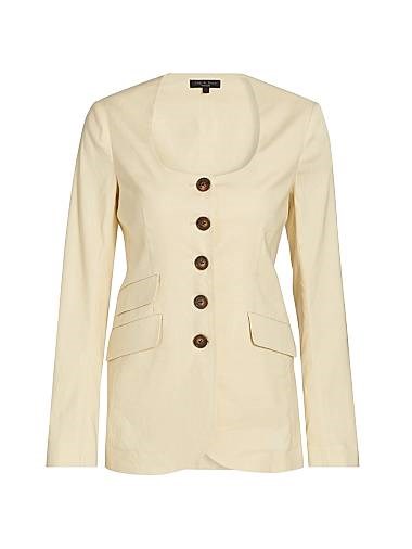 Блейзер Roslyn от Rag & Bone выполнен из легкого льняного смесового материала и имеет безворотовый дизайн с вырезом.